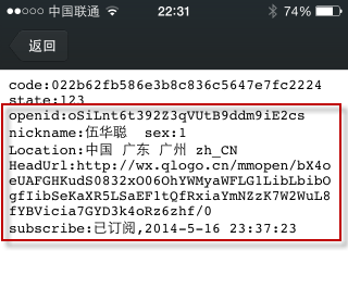 為了演示上面兩種獲取數據的不同,我把他們傳過來的code的值,用戶換取OpenID後進行用戶信息的解析,他們兩者的結果都是一樣了。具體測試界面如下所示。