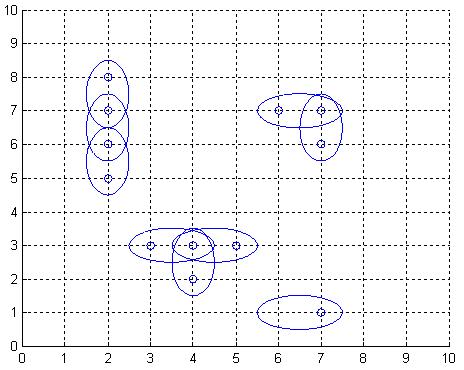The Global Aerial Research Centre has been allotted the task of building the fifth generation of mobile phone nets in Sweden. The most striking reason why they got the job, is their discovery of a new, highly noise resistant, antenna. It is called 4DAir, and comes in four types. Each type can only transmit and receive signals in a direction aligned with a (slightly skewed) latitudinal and longitudinal grid, because of the interacting electromagnetic field of the earth. The four types correspond to antennas operating in the directions north, west, south, and east, respectively. Below is an example picture of places of interest, depicted by twelve small rings, and nine 4DAir antennas depicted by ellipses covering them.