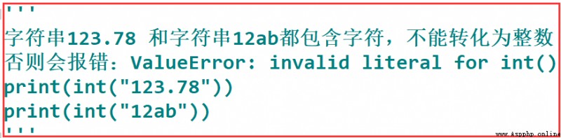 int()# Convert to an integer print(int("123")) # 123print(int(123.78)) # 123print(int(False)) # 0print(int(True)) # 1 It should be noted that : The conversion will fail in the following two cases