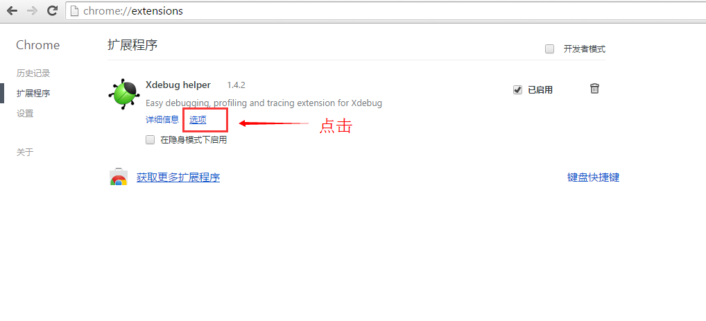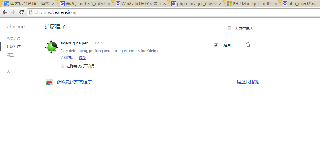 接下來就是IDE的安裝了,PHPStorm安裝還是很簡單的,這裡也不做多說,Xdebug helper是Chrome的一個擴展工具,在浏覽器中輸入chrome://extensions/,然後將下載下來的crx文件拖入該頁面就可以了。