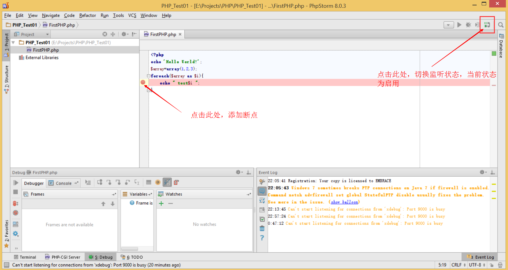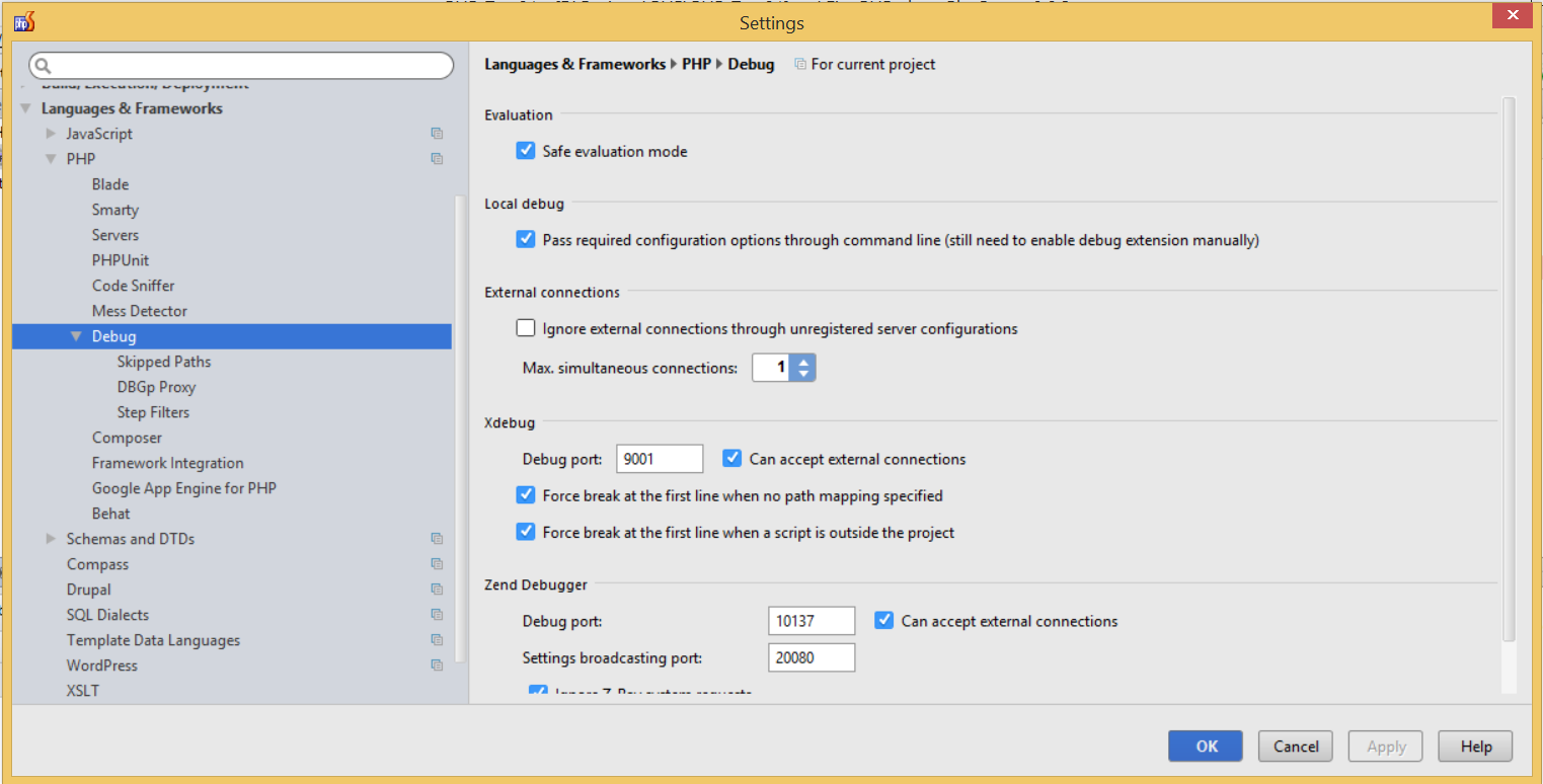 接下來就是配置phpStorm的debug了。其實phpstorm的debug基本都有默認設置了,但我們最好還是要修改一下,因為可能9000端口被其他應用占用了。所以我們需要更改為其他端口,例如9001