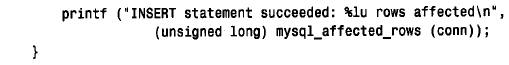 請注意在打印時mysql_ a ffected_rows() 的結果是如何轉換為unsigned long 類型的,這個函數返回一個my_ulonglong 類型的值,但在一些系統上無法直接打印這個類型的值(例如,筆者觀察到它可在FreeBSD 下工作,但不能在Solaris 下工作)。把值轉換為unsigned long 類型並使用‘% l u’打印格式可以解決這個問題。同樣也要考慮返回my_ulonglong 值的其他函數,如mysql_num_rows() 和mysql_ insert _ id ( )。如果想使客戶機程序能跨系統地移植,就要謹記這一點。