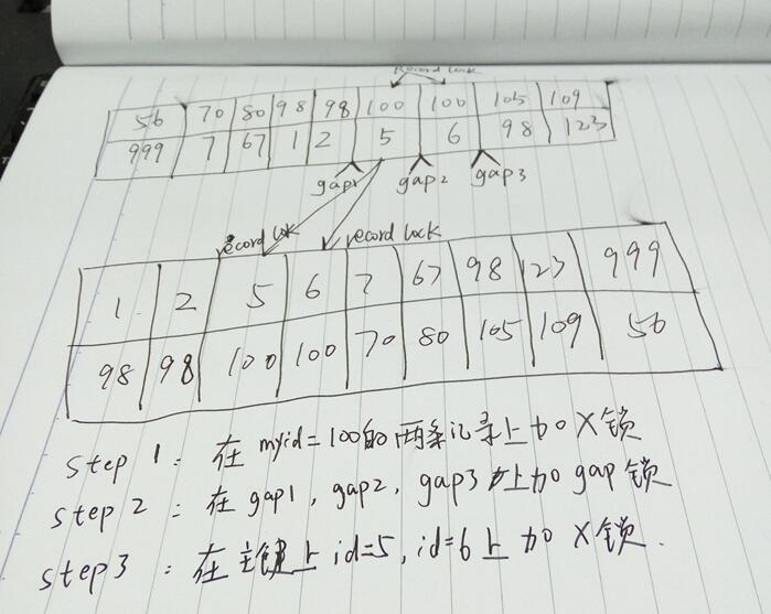 從圖中的數據組織順序可以看出,myid=100的記錄有兩條,如果加gap鎖就會產生三個間隙,分別是gap1(98,100),gap2(100,100),gap3(100,105),在這三個開區間(如果我高中數學沒記錯的話)內的myid數值無法插入,顯然gap1還有(myid=99,id=3)(myid