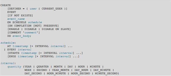 關於如何創建,修改event這裡不做敘述,創建語法如下,具體的含義可參考下面關於event信息表介紹。也可以參考官網文檔鏈接,http://dev.mysql.com/doc/refman/5.6/en/create-event.html