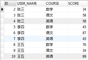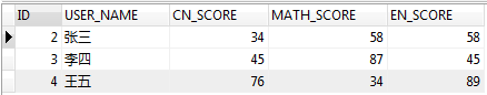 select user_name, '語文' COURSE , CN_SCORE as SCORE from test_tb_grade2 union select user_name, '數學' COURSE, MATH_SCORE as SCORE from test_tb_grade2 union select user_name, '英語' COURSE, EN_SCORE as SCORE from test_tb_grade2 order by user_name,COURSE;