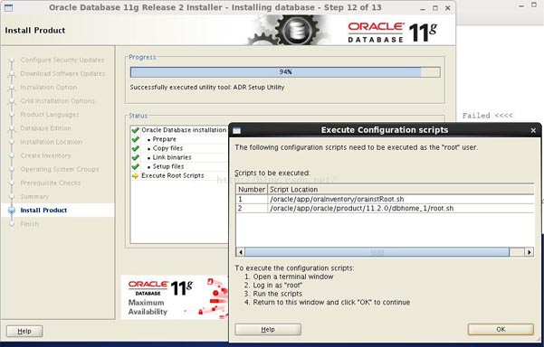 如果安裝完成,會彈出ExecuteConfiguration scripts所示,選擇OK完成oracle軟件安裝,如013.png所示: