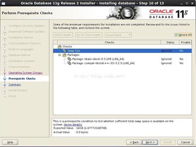 然後,執行checksoracle基礎組件,如果有libaio、compat的提示,直接IgnoreAll即可,next下一步如010.png所示: