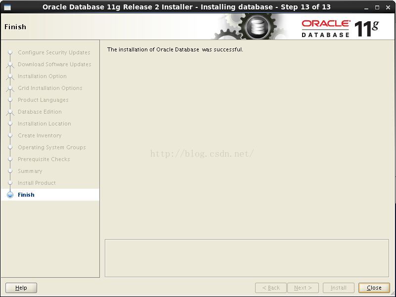 之後,看到oracle安裝到最好一步Finish,選擇close結束,如014.png所示: