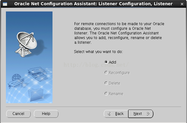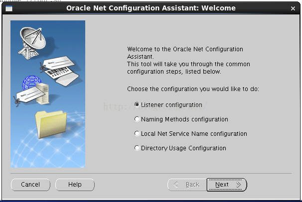 在shell命令行sudo – oracle,然後執行netca命令,出現如下界面,選擇默認的listener configure配置,如下015.png: