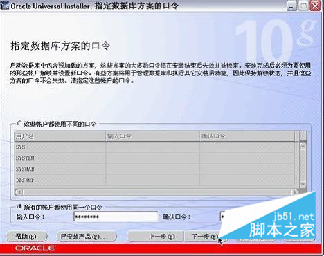 為簡化評估用數據庫的密碼設定,選擇所有的帳戶都使用同一個口令,輸入SYSTEM 等用戶的口令(口令不要以數字開頭),並按下一步按鈕