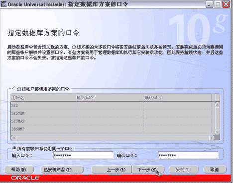 為簡化評估用數據庫的密碼設定,選擇所有的帳戶都使用同一個口令,輸入 SYSTEM 等用戶的口令(口令不要以數字開頭),並按下一步按鈕