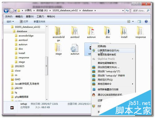 如果是在win7上安裝,如圖:在setup文件上點擊右鍵,選擇以“管理員身份運行”。