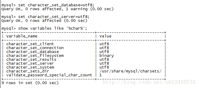 set character_set_server=utf8; set character_set_database=utf8; show variables like '%char%';