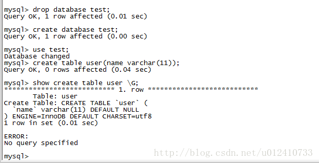 drop database test; create database test; use test; create table user(name varchar(11)); show create table user \G;