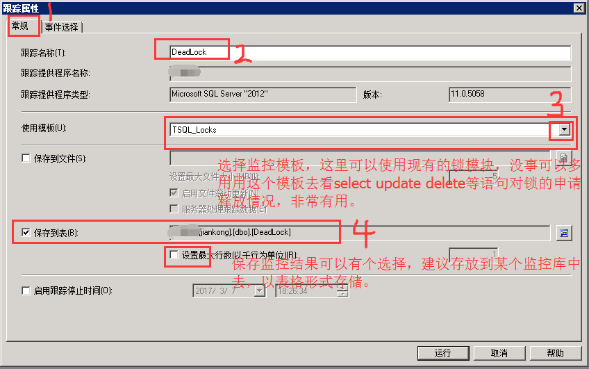 登錄到需要監控的DB實例,填寫相應的跟蹤屬性,首先是<常規>頁面,如下圖。這裡注意2個方面,第一,選擇 <TSQL-Locks>模板,這個模板即可以用來監控死鎖,也可以拿來觀察 鎖申請與釋放情況,非常詳細,有事沒事可以多拿來看SELECT UPDATE DELETE等語句對鎖的申請及釋放情況;第二,監控結果存儲,建議可以存放到某個表格中去,方便定期分析與統計。