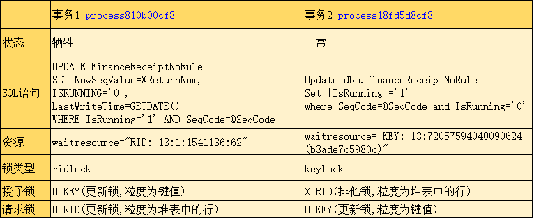 <deadlock-list> <deadlock victim="process810b00cf8"> <process-list> <process id="process810b00cf8" taskpriority="0" logused="0" waitresource="RID: 13:1:1541136:62" waittime="7682" ownerId="3396587959" transactionname="UPDATE" lasttranstarted="2016-01-08T12:03:51.067" XDES="0xa99746d08" lockMode="U" schedulerid="41" kpid="17308" status="suspended" spid="108" sbid="0" ecid="0" priority="0" trancount="2" lastbatchstarted="2016-01-08T12:03:51.067" lastbatchcompleted="2016-01-08T12:03:51.067" lastattention="1900-01-01T00:00:00.067" clientapp="Microsoft SQL Server Management Studio - 查詢" hostname="test-server" hostpid="1433" loginname="xinysu" isolationlevel="read committed (2)" xactid="3396587959" currentdb="13" lockTimeout="4294967295" clientoption1="671098976" clientoption2="390200"> <executionStack> <frame procname="adhoc" line="7" stmtstart="214" stmtend="484" sqlhandle="0x020000003acf4f010561e479685209fb09a7fd15239977c60000000000000000000000000000000000000000"> UPDATE FinanceReceiptNoRule SET NowSeqValue=@ReturnNum,ISRUNNING='0',LastWriteTime=GETDATE() WHERE IsRunning='1' AND SeqCode=@SeqCode </frame> </executionStack> <inputbuf> declare @SeqCode varchar(60) declare @ReturnNum bigint set @SeqCode='CGJS20160106' while(1=1) begin UPDATE FinanceReceiptNoRule SET NowSeqValue=@ReturnNum,ISRUNNING='0',LastWriteTime=GETDATE() WHERE IsRunning='1' AND SeqCode=@SeqCode end </inputbuf> </process> <process id="process18fd5d8cf8" taskpriority="0" logused="248" waitresource="KEY: 13:72057594040090624 (b3ade7c5980c)" waittime="4" ownerId="3396522828" transactionname="user_transaction" lasttranstarted="2016-01-08T12:03:05.310" XDES="0x18c1db63a8" lockMode="U" schedulerid="57" kpid="16448" status="suspended" spid="161" sbid="0" ecid="0" priority="0" trancount="2" lastbatchstarted="2016-01-08T12:03:58.737" lastbatchcompleted="2016-01-08T12:03:33.847" lastattention="2016-01-08T12:03:33.850" clientapp="Microsoft SQL Server Management Studio - 查詢" hostname="test-server" hostpid="1433" loginname="xinysu" isolationlevel="read committed (2)" xactid="3396522828" currentdb="13" lockTimeout="4294967295" clientoption1="671090784" clientoption2="390200"> <executionStack> <frame procname="adhoc" line="6" stmtstart="210" stmtend="400" sqlhandle="0x020000001b4f23368af7bba99098c10dec46585804f1b4ce0000000000000000000000000000000000000000"> Update dbo.FinanceReceiptNoRule Set [IsRunning]='1' where SeqCode=@SeqCode and IsRunning='0' </frame> </executionStack> <inputbuf> declare @SeqCode varchar(60) declare @ReturnNum bigint set @SeqCode='CGJS20160106' while(1=1) begin Update dbo.FinanceReceiptNoRule Set [IsRunning]='1' where SeqCode=@SeqCode and IsRunning='0' end </inputbuf> </process> </process-list> <resource-list> <ridlock fileid="1" pageid="1541136" dbid="13" objectname="fin_test.dbo.FinanceReceiptNoRule" id="lock51e8a3980" mode="X" associatedObjectId="72057594040025088"> <owner-list> <owner id="process18fd5d8cf8" mode="X" /> </owner-list> <waiter-list> <waiter id="process810b00cf8" mode="U" requestType="wait" /> </waiter-list> </ridlock> <keylock hobtid="72057594040090624" dbid="13" objectname="fin_test.dbo.FinanceReceiptNoRule" indexname="PK_FINANCERECEIPTNORULE" id="lock7b2c6bc80" mode="U" associatedObjectId="72057594040090624"> <owner-list> <owner id="process810b00cf8" mode="U" /> </owner-list> <waiter-list> <waiter id="process18fd5d8cf8" mode="U" requestType="wait" /> </waiter-list> </keylock> </resource-list> </deadlock> </deadlock-list>