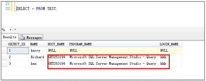那麼我們接下來在表上面新增幾個字段 [HOST_NAME]、[PROGRAM_NAME]、LOGIN_NAME用來記錄最後一次修改該記錄的會話信息,另外創建觸發器TRG_TEST來更新這幾個字段