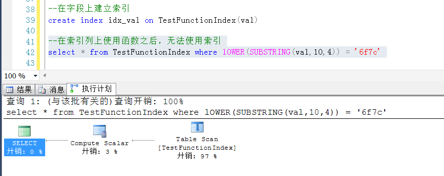 Create Table TestFunctionIndex ( id int identity(1,1), val varchar(50), subval as LOWER(SUBSTRING(val,10,4)) persisted --增加一個持久化計算列 ) GO --在持久化計算列上建立索引 create index idx_subvar on TestFunctionIndex(subval) GO --插入10W行測試數據 insert into TestFunctionIndex(val) values (NEWID()) go 100000
