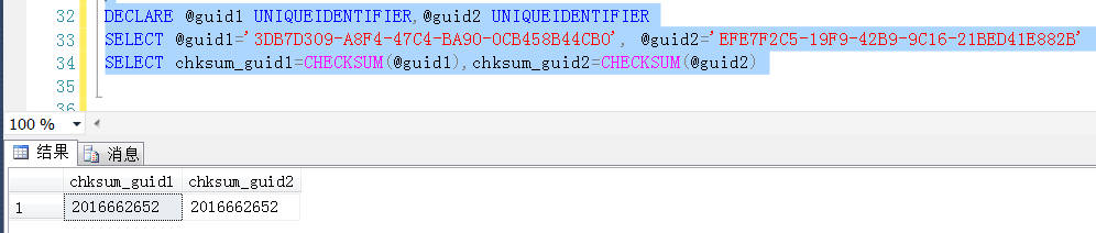 這裡使用的是HASHBYTES加密函數,對字符串加密,然後對加密之後的數據生成一個UNIQUEIDENTIFIER,重復的概率就小的多的多了