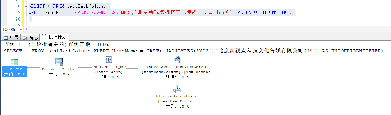 參考如下查詢,就可以使用HashName計算出來的值與計算列做比較,在一定程度上可以減少檢索字段索引的大小,又能達到目的的效果