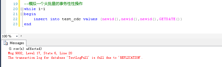 在建庫的時候日志文件有限制成了512M,因為這個表上開啟了CDC,寫數據這個過程會產生事務日志,日志有空空間限制在寫入數據的過程中,一開始是沒有問題的,隨著數據的不斷寫入(Replication狀態的日志不斷積壓),當日志全部使用之後,下面的報錯就會產生了