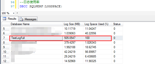 此時觀察事務日志的使用情況,發現已經是完全使用了,