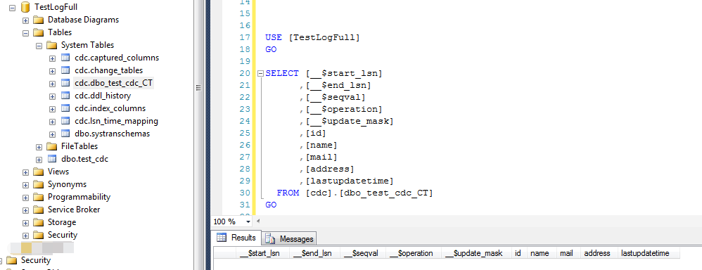 USE TestLogFull --啟用CDC EXECUTE sys.sp_cdc_enable_db; GO --創建一張測試表 create table test_cdc ( id int identity(1,1) primary key, name nvarchar(50), mail varchar(50), address nvarchar(50), lastupdatetime datetime ) --對表啟用CDC EXEC sys.sp_cdc_enable_table @source_schema = 'dbo', @source_name = 'test_cdc', @role_name = 'cdc_admin', @capture_instance = DEFAULT, @supports_net_changes = 1, @index_name = NULL, @filegroup_name = DEFAULT