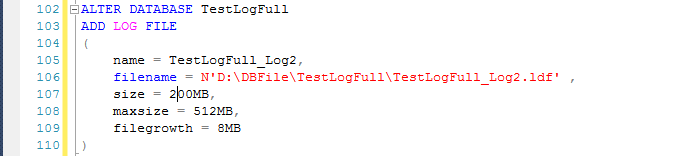 USE master GO CREATE DATABASE TestLogFull ON PRIMARY ( NAME = N'TestLogFull', FILENAME = N'D:\DBFile\TestLogFull\TestLogFull.mdf' , SIZE = 500MB , MAXSIZE = UNLIMITED, FILEGROWTH = 100MB ) LOG ON ( NAME = N'TestLogFull_log', FILENAME = N'D:\DBFile\TestLogFull\TestLogFull_Log.ldf' , SIZE = 1MB , MAXSIZE = 512MB )