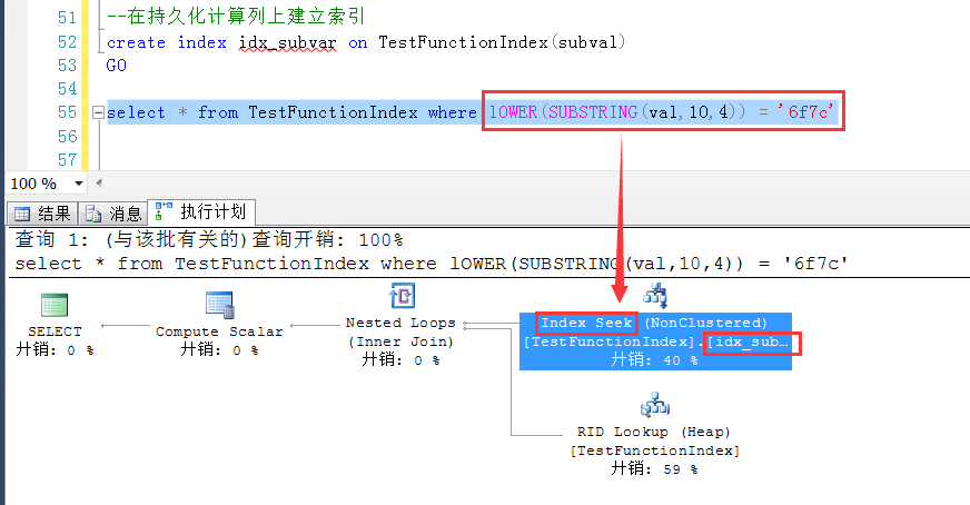 Create Table TestFunctionIndex ( id int identity(1,1), val varchar(50), subval as LOWER(SUBSTRING(val,10,4)) persisted --增加一個持久化計算列 ) GO --在持久化計算列上建立索引 create index idx_subvar on TestFunctionIndex(subval) GO --插入10W行測試數據 insert into TestFunctionIndex(val) values (NEWID()) go 100000