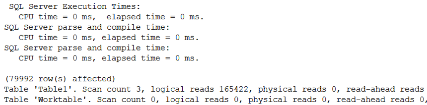 為了演示這個性能問題,接下來的查詢我指定查詢優化器使用特定的非聚集索引。查詢本身返回80000行,因為對於每個查詢執行,SQL Server需要進行書簽查找80000次——反復執行。