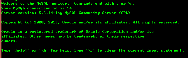其中-h 表示你的主機地址(本機就是localhost,記住不要帶端口號) -u 就是連接數據庫名稱 -p就是連接密碼。出現以下圖就表示連接成功了
