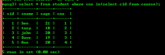 某些情況下,當進行查詢的時候,需要的條件是另外一個select語句的結果,這個時候就用到了子查詢,用於子查詢的關鍵字主要包括in、not in、=、!=、exist、not exist等