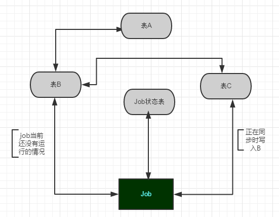 3. 建立同步數據的作業Job1和記錄Job1運行狀態的表,在同步的時候比較關鍵的是需要檢查Job1的當前狀態,如果當前正在將B的數據同步到A,則把服務端過來的數據存到C,然後再把數據導入到B,等到下一次Job執行的時候再將這批數據轉到A。如圖1: